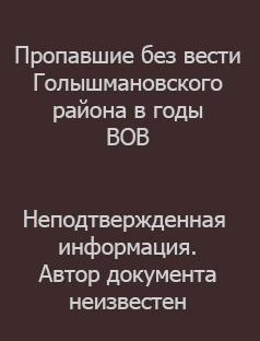 Участники ВОВ Голышмановского района, пропавшие без вести. Неподтвежденная информация Автор документа неизвестен Посмотреть библиографическое описаниеУчастники ВОВ Голышмановского района, пропавшие без вести. Неподтвежденная информация. — Текст : электронный // : [сайт]. — URL: https://disk.yandex.ru/i/R5VrMZ_TO7RGoQ (дата обращения: 17.10.2025). |